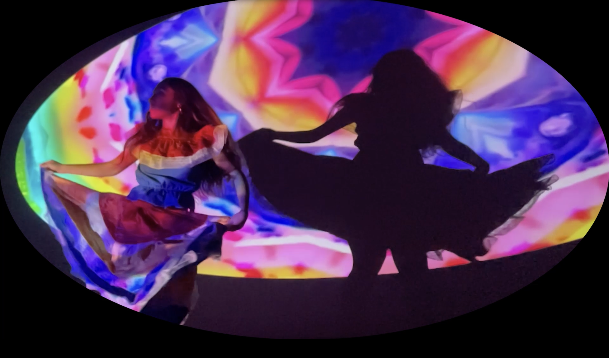 BAILE is a video work that explores the integration of light, time and Latin Culture. The artist dances over a colourful moving projection that casts another dancing shadow. Her movements are slowed and at times reversed, as if the skirt and the dancer are taking turns pulling one another. BAILE highlights the beauty of traditional South American Dance whilst also crafting a meditative and peaceful state.