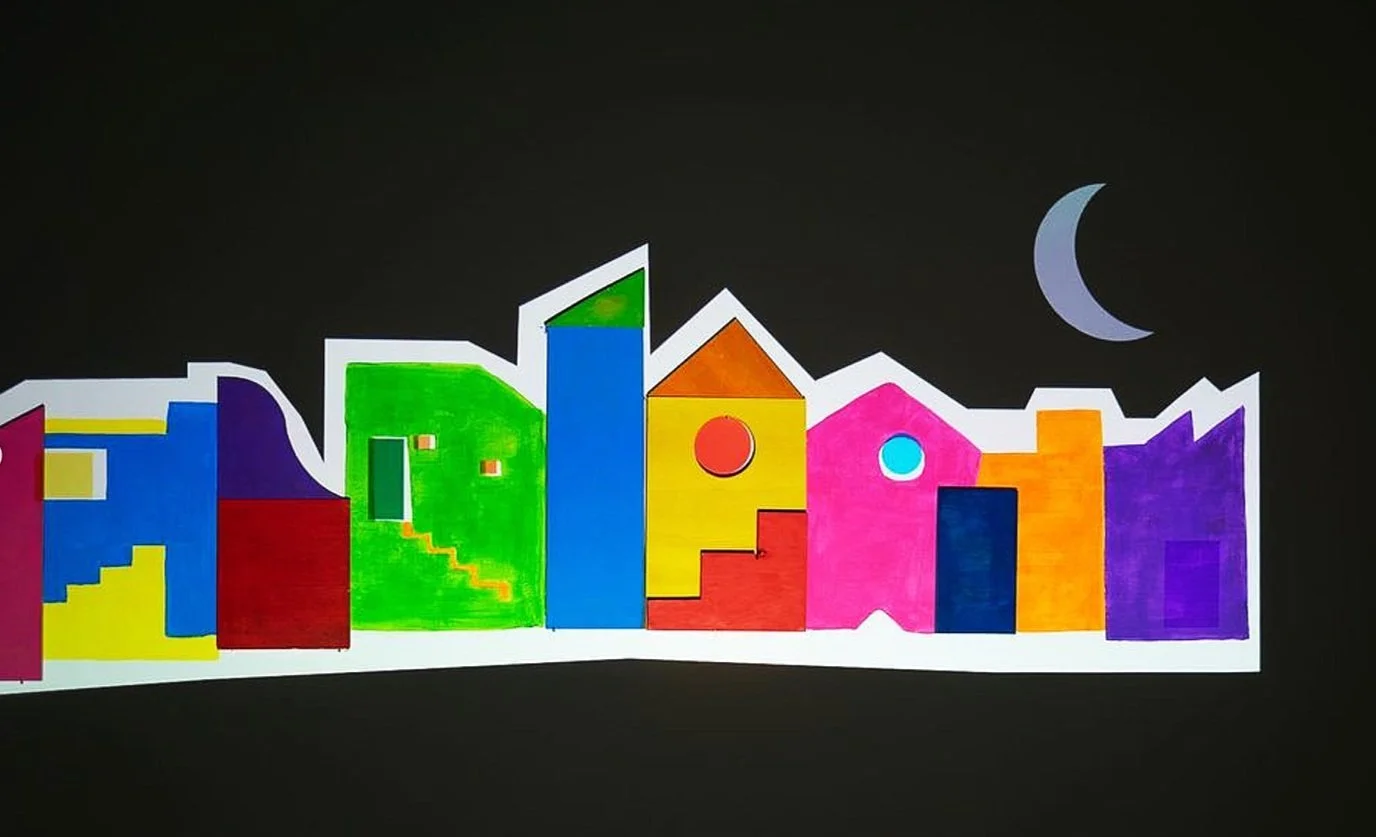 Inspired by the saturated hues of South-American architecture, Casas Vivas, captures the vibrancy and sound of everyday life El Salvador, Martinez’ country of heritage. The video shifts from day, to rainfall, to night, with its windows illuminated. Martinez uses colour, sound and childlike forms to express the innate youth and joy embedded within Latin culture.